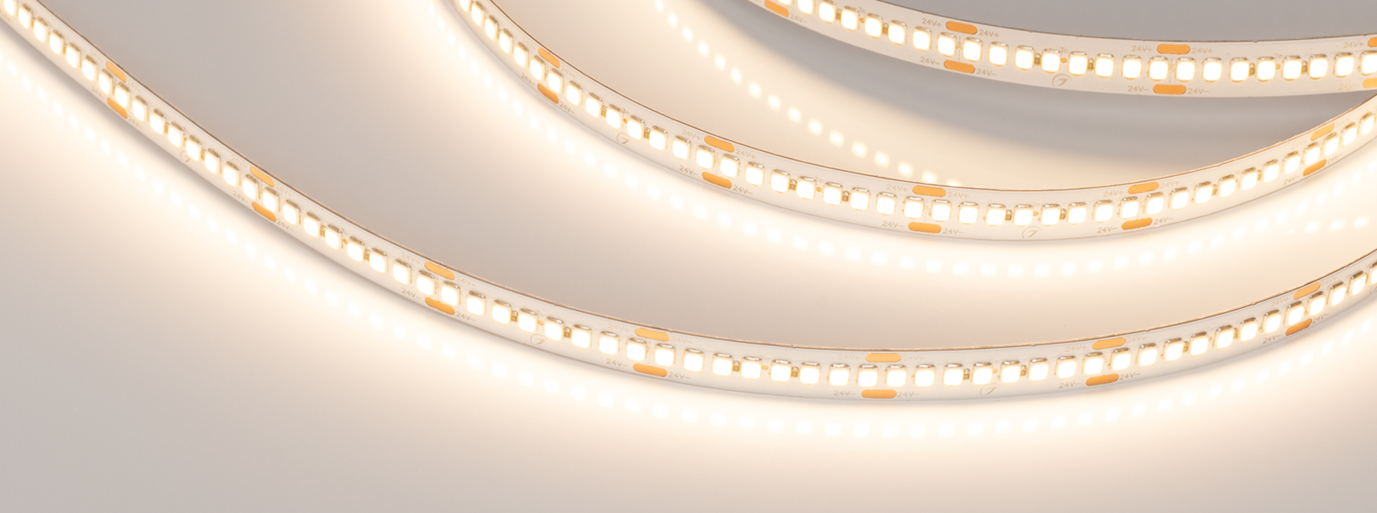 Высокоэффективная светодиодная лента RT серии A240, эффективность 150 лм/Вт. Светодиоды SMD 2835, 240 шт/м, теплого цвета свечения (3000K), минимальный отрезок 33.33 мм, 8 светодиодов. Индекс цветопередачи CRI>85. Предназначена для применения в основном энергоэффективном освещении жилых и офисных помещений, подсветки рекламных конструкций и витрин, декоративной подсветки интерьера, потолочных ниш. Обязательная установка на профиль.