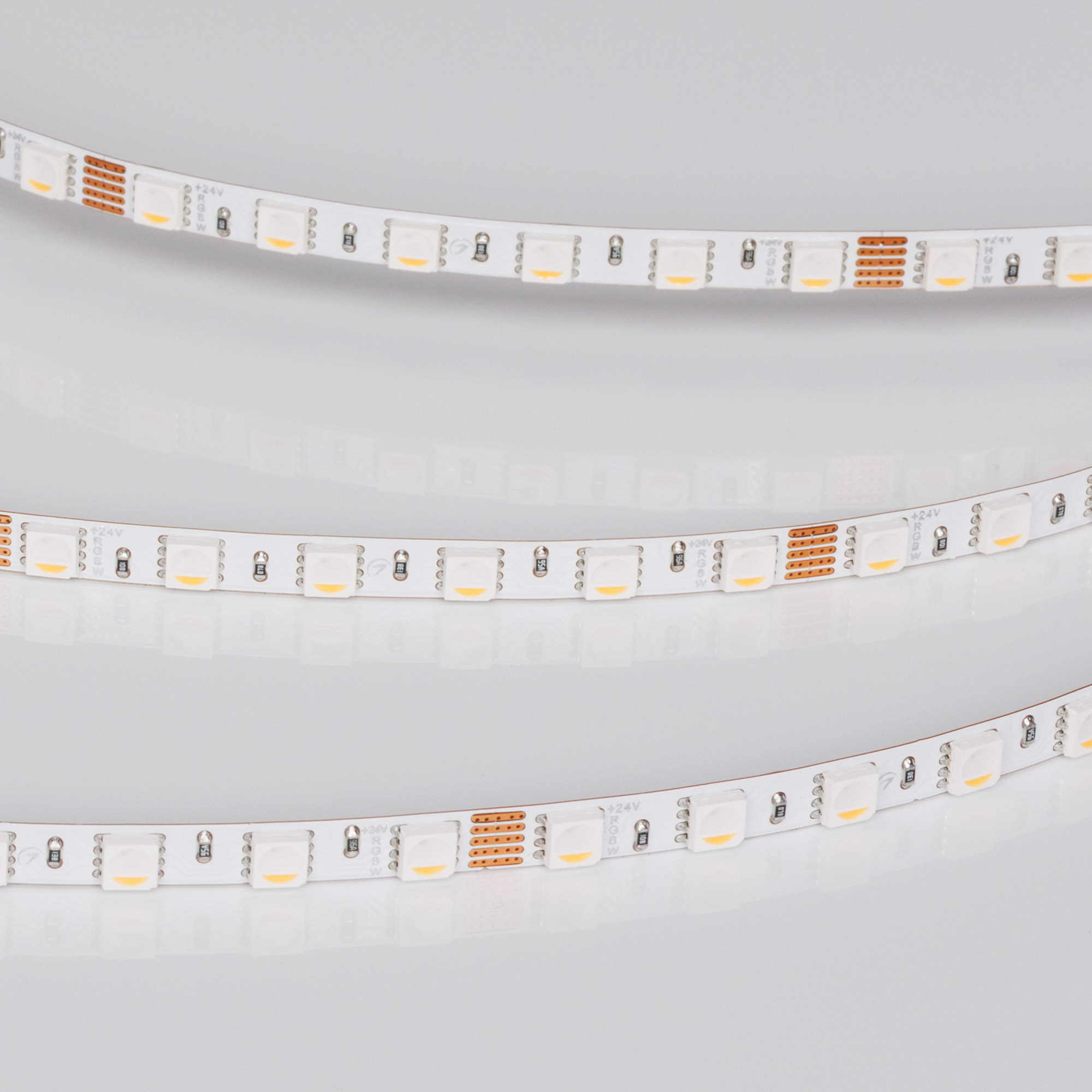 Светодиодная узкая лента RT серии H96. Светодиоды SMD 4040, 96 шт/м, белая плата, ширина 5 мм, скотч 3M. Цвет RGB + ТЕПЛЫЙ 3000K, индекс цветопередачи CRI>90, угол 120°. Питание 24 В, мощность 10 Вт/м (50 Вт на 5 м). Размеры 5000x5x2 мм, мин. отрезок 62.5 мм, 6 светодиодов. Цена за 1 м. Обязательна установка на профиль.