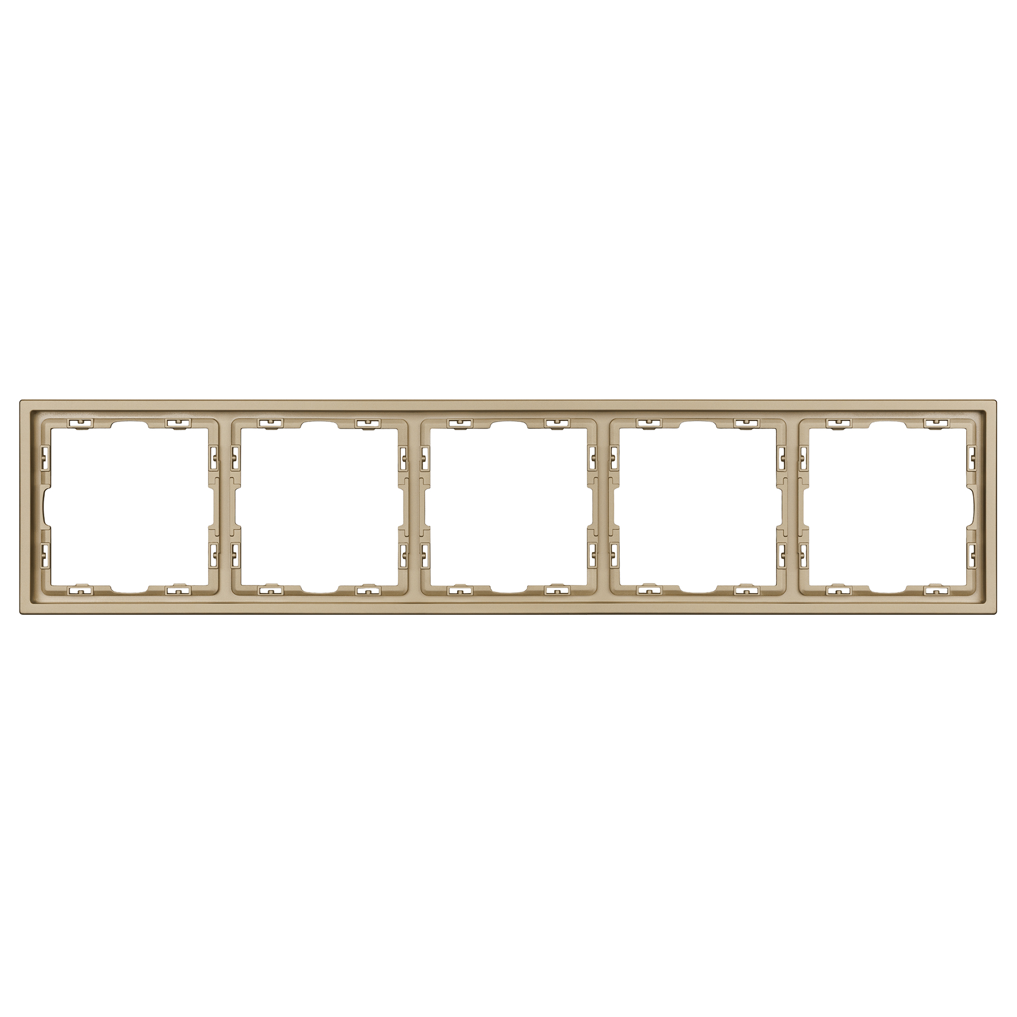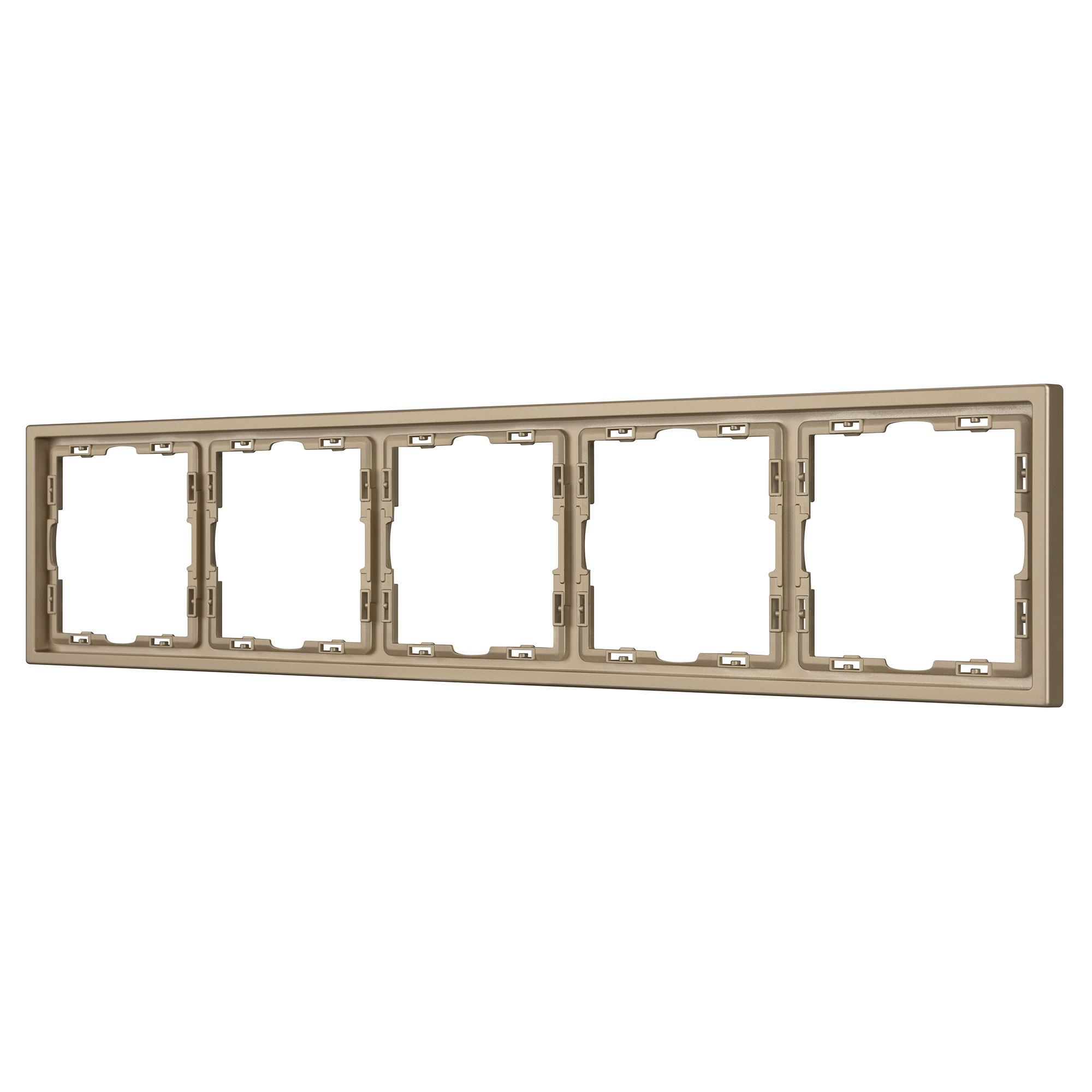 Рамка пластиковая на 5 постов, под встраиваемый механизм. Цвет - золотой, с Soft-Touch покрытием. Среднего уровня герметичности IP20. Ориентация монтажа горизонтальная.