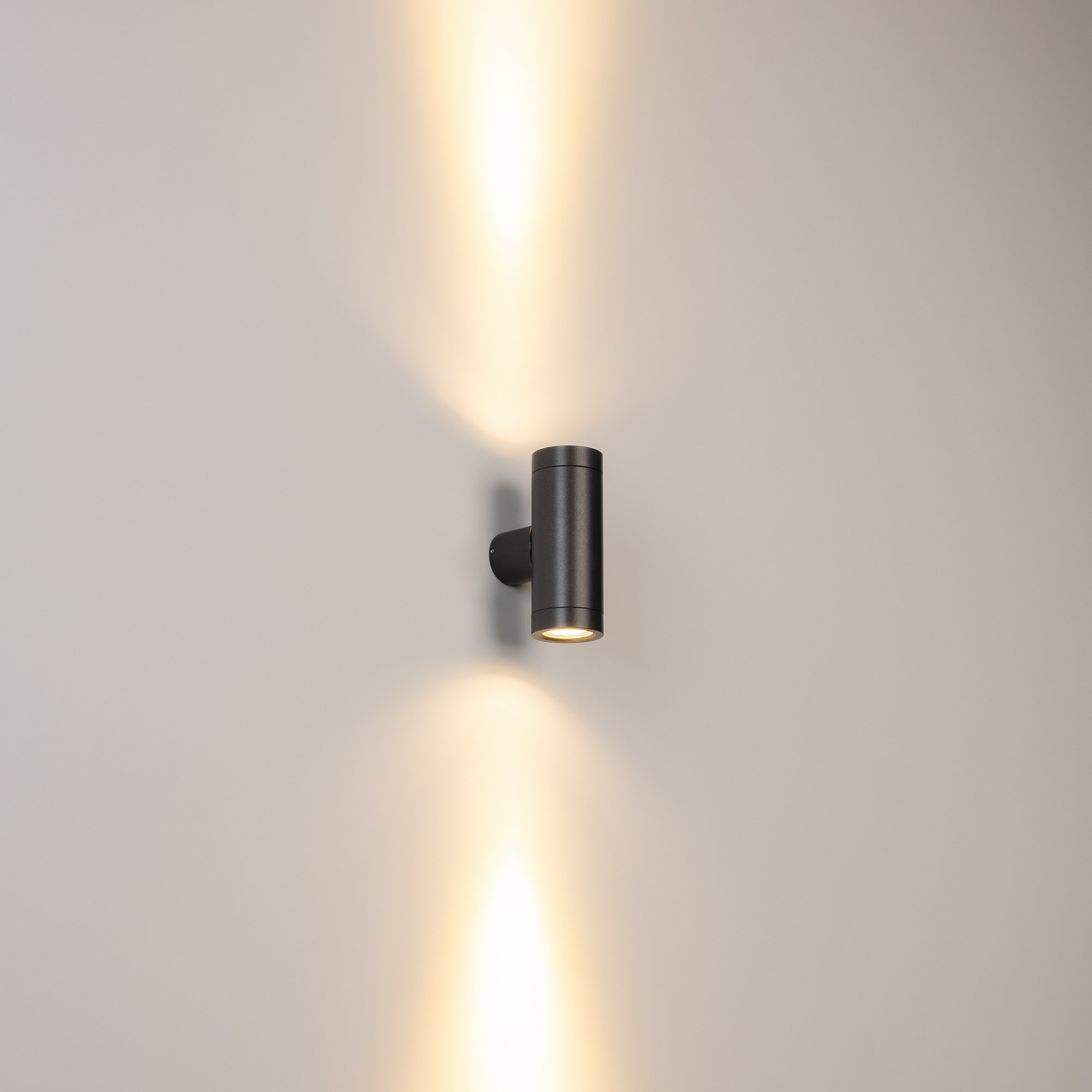 Накладной настенный светильник, свечение вверх/вниз. Мощность 7,5 Вт, св. поток 800 лм, 106 лм/Вт, теплый 3000 K, CRI>80, угол 2x24°, напряжение питания 230 В. Темно-серый фигурный корпус из алюминия, экран стекло, степень защиты IP65. Размер: длина 116 мм, ширина 46 мм, высота 76 мм. Монтаж накладной. Драйвер встроенный, пульсация <1%.