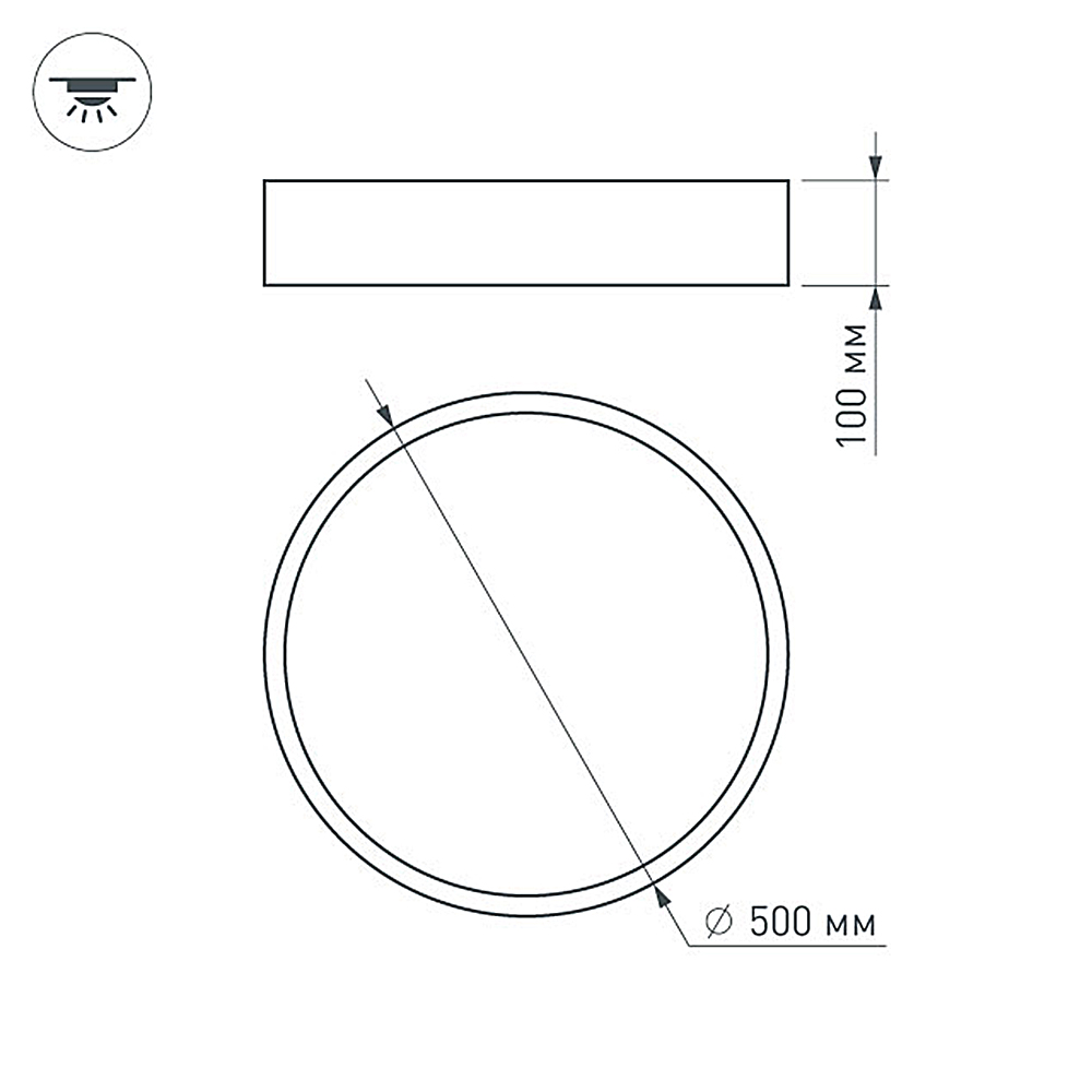 Накладной интерьерный светильник. Мощность 35 Вт, св. поток 2840 лм, 80 лм/Вт, теплый 3000 K, CRI>80, угол 100°, напряжение питания 230 В. Черный круглый корпус из алюминия, степень защиты IP20. Призматический акриловый рассеиватель. Размер: диаметр 500 мм, высота 100 мм. Монтаж накладной. Драйвер 30-42 В, 950 мА, пульсация <2%.